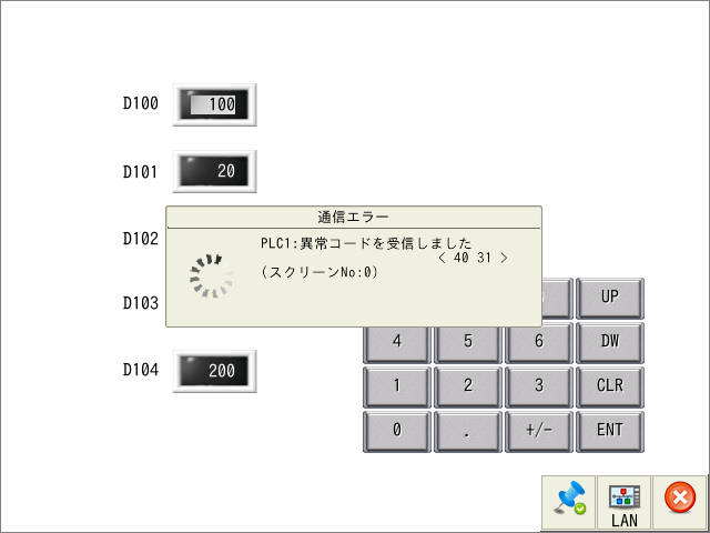 4031 デバイス指定エラー 画面データに設定した PLCデバイスに範囲外のアドレスがないか確認し、設定し直す