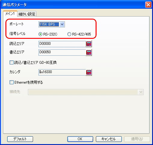 設定箇所 : V-SFT-5の[システム設定]→[PLC通信]→[PLC機種]、[通信パラメータ]