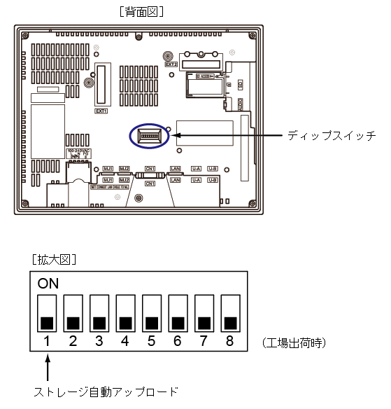 ディップスイッチのNo1がONの場合、自動アップロードが有効になり、ストレージにアクセスします。自動アップロード用の画面データを格納したストレージを装着してください。