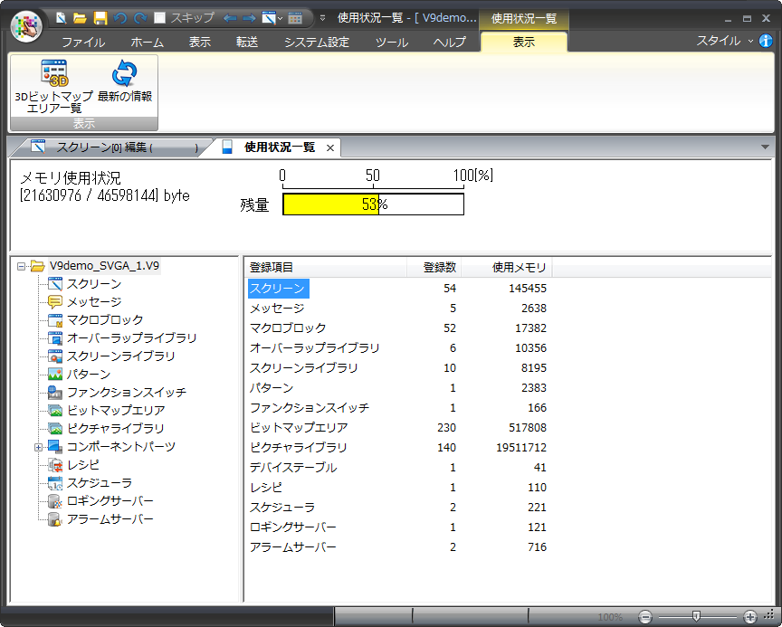 V-SFT-6の[ツール]→[使用状況一覧]で、画面データのサイズを確認してください。