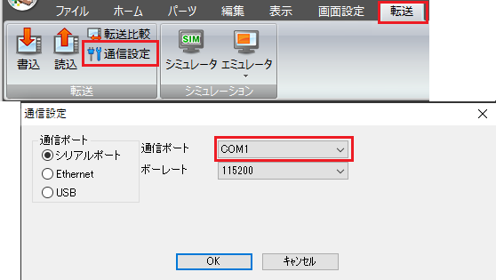 パソコンの[デバイスマネージャー]でCOMポートNo. を確認し、[転送]→[通信設定]ダイアログの[通信ポート]もこのポートNo. に合わせます。