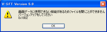 *Ver. 5.4.14.0以降のバージョンから、上記が原因の場合、以下のメッセージダイアログが表示されます。同じく、V-SFTを最新のバージョンにアップしてください。