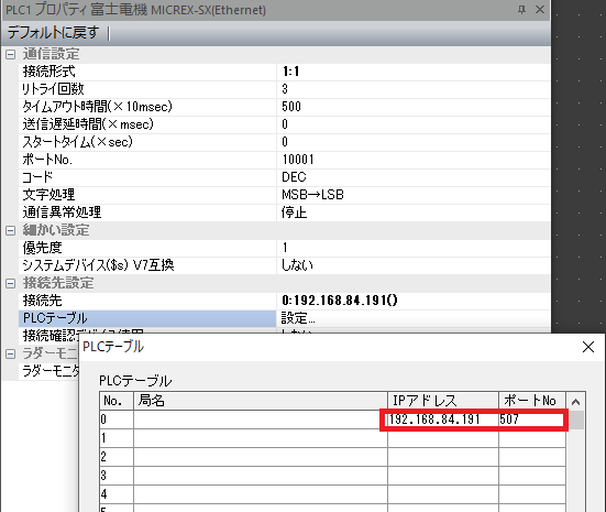 「システム設定」→「ハードウェア設定」→「PLC設定」→[PLCテーブル]→[設定]をクリック