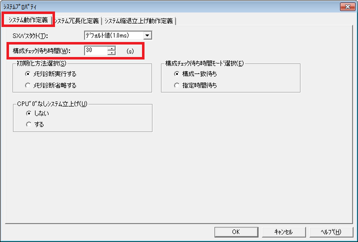 - [システム動作定義]タブの「構成チェック待ち時間」を以下のように設定してください。