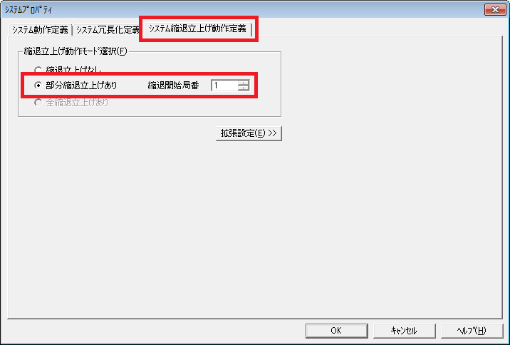 - [システムプロパティ]ダイアログで[システム縮退立上げ動作定義]タブをクリックします。