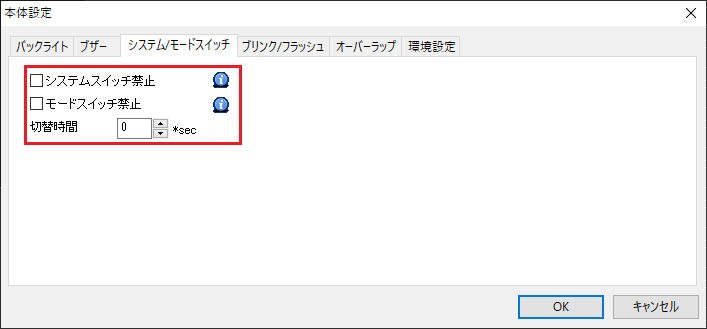 切り替え時間は、以下の設定で確認できます。 設定箇所 : V-SFTの [システム設定]→[本体設定]→[システム/モードスイッチ] |