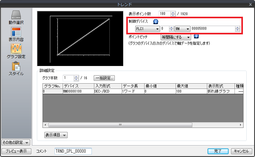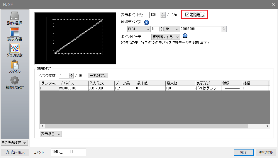[常時表示]にチェックすると、制御デバイスで指定した実?ポイント数分のグラフを常時表示します。