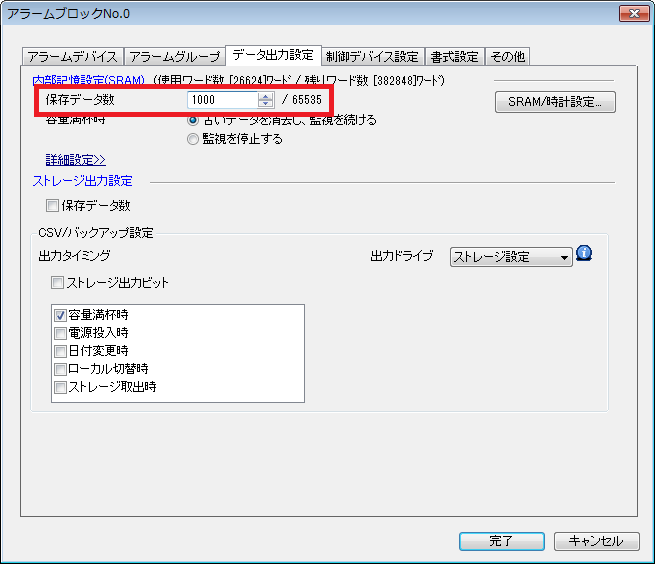 [システム設定]→[アラームサーバー]→[データ出力先]→[保存データ数]の設定数が少ない。