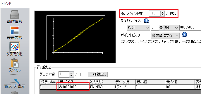 1. 各グラフNo. に設定した[デバイス]を先頭に、[表示ポイント数]分のデバイスにデータが格納されているか確認してください。