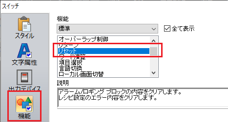 2. スイッチダイアログ→[機能]→「標準:リセット」 に設定されているか、確認してください。