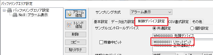 PLCデバイスを使用してクリアすることも可能です。 この場合、サンプルコントロールデバイスのリセットビットをONしてください。