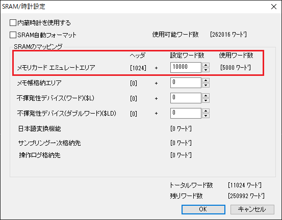 1. [システム設定]→[本体設定]→[SRAM/時計]→[メモリカードエミュレートエリア]で、「使用ワード数」以上の値を「設定ワード数」に指定してください。