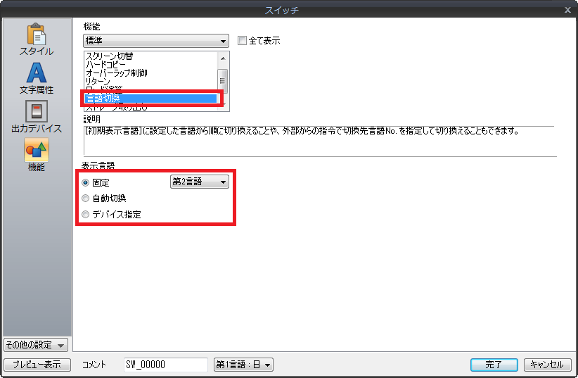 1. スイッチ「機能:言語切換」 に誤った言語No. を指定している。