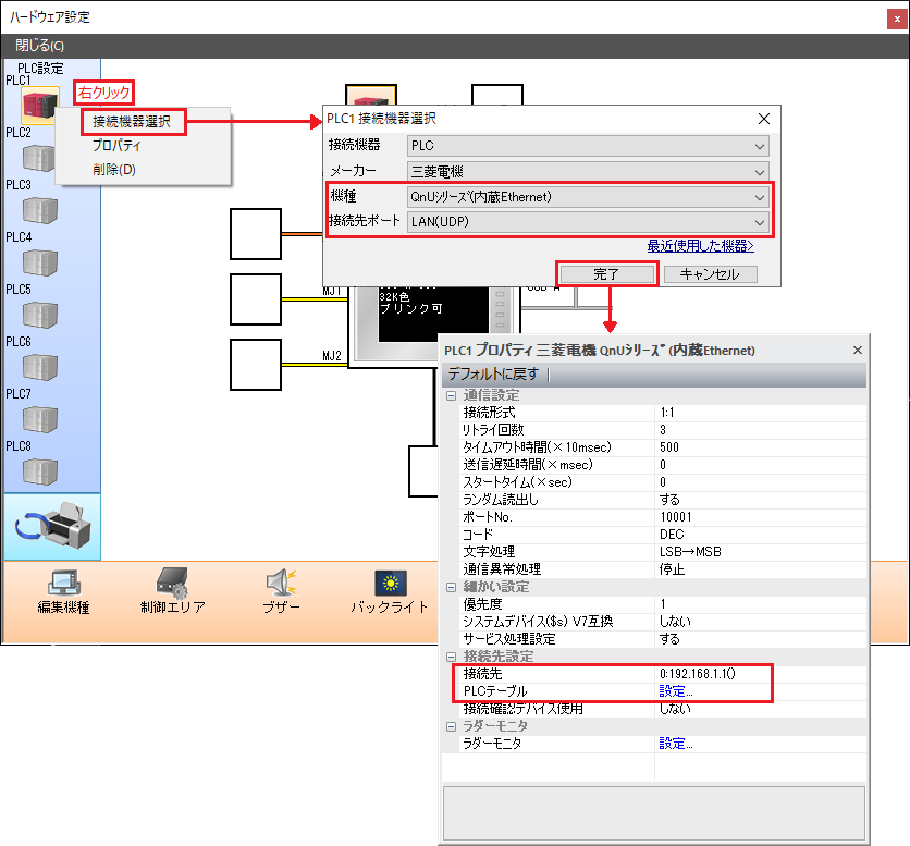 • [PLC1 プロパティ]→[接続先設定]→[PLCテーブル]にPLCのIPアドレスとポートNo.を設定