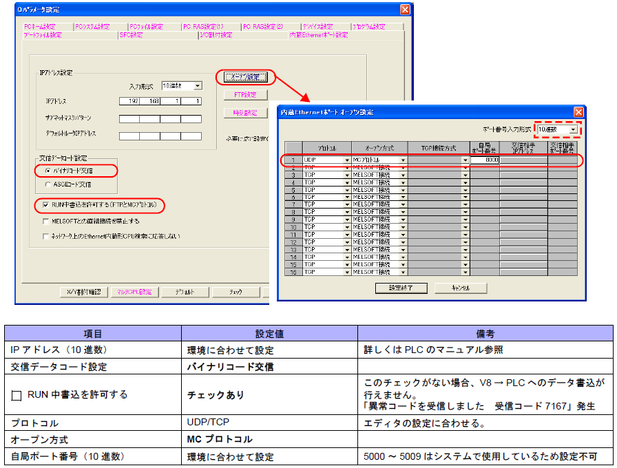 * 後述のPLCで設定するIPアドレス、自局ポート番号と合わせます。