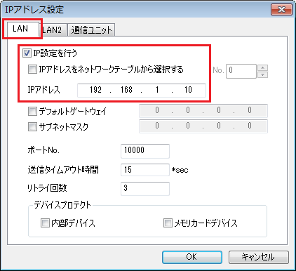 [システム設定]→[Ethernet通信]→[自局アドレス]→[LAN]タブ→[IP設定を行う]にチェックし、IPアドレスを設定します。