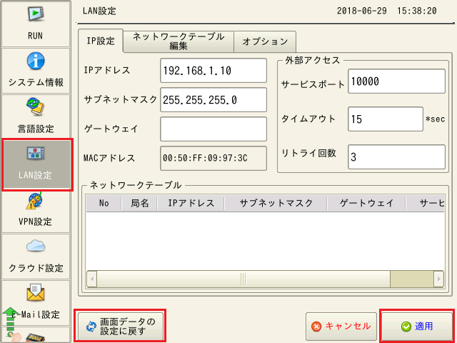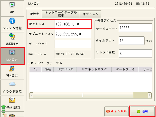 V10/V9の[ローカル画面]→[LAN設定]メニューで、IPアドレスを設定し、画面右下の[適用]スイッチで確定します。