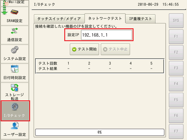• ローカル画面の[I/Oチェック]メニュー→[ネットワークテスト]で、PLCのIPアドレスに対してネットワークテストができます。
