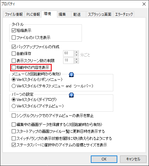 (チェックありの場合、パーツを移動する間、エディタ上にパーツの描画が