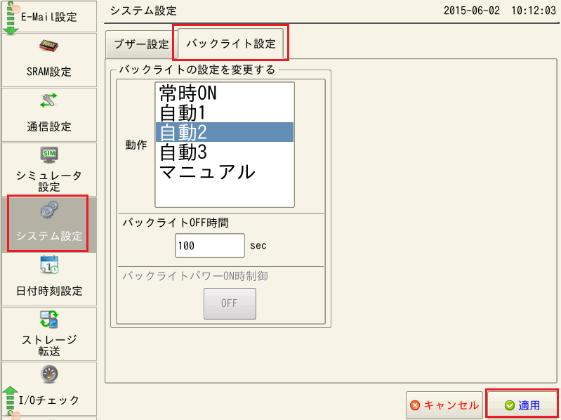 ローカル画面の[システム設定]メニュー→[バックライト設定]タブ