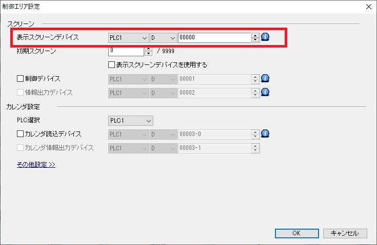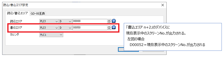 V8シリーズ以前の機種から変換した画面データの場合、「制御エリア」は使用しません。「書込エリア n+2」のデバイスに表示中のスクリーンNo.が格納されます。 設定箇所は以下を確認してください。
