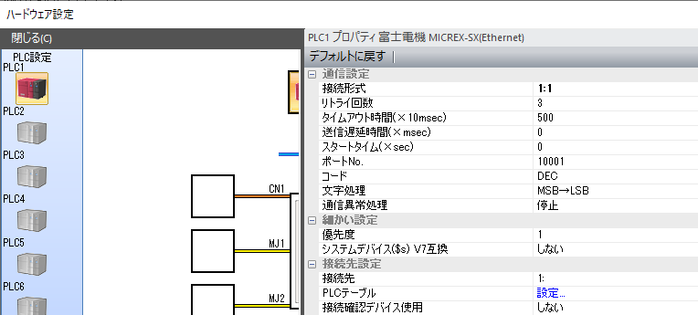 「システム設定」→[ハードウェア設定]で対象のPLCをクリックし、プロパティを表示します。