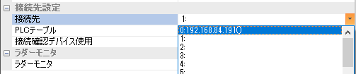 Ethernet接続の場合、[ハードウェア設定]→[PLC設定]→[プロパティ]→[接続先]に未登録のPLCテーブルNoを設定している。