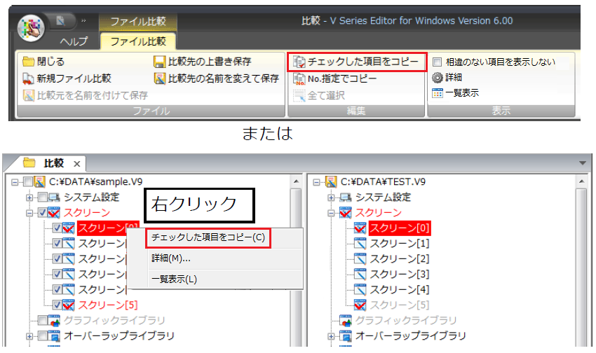 [OK]をクリックすると、比較結果のウィンドウが表示されます。(赤いレ点は不一致箇所です。)コピーする項目をチェックし、右クリックメニューの[チェックした項目をコピー]をクリックします。