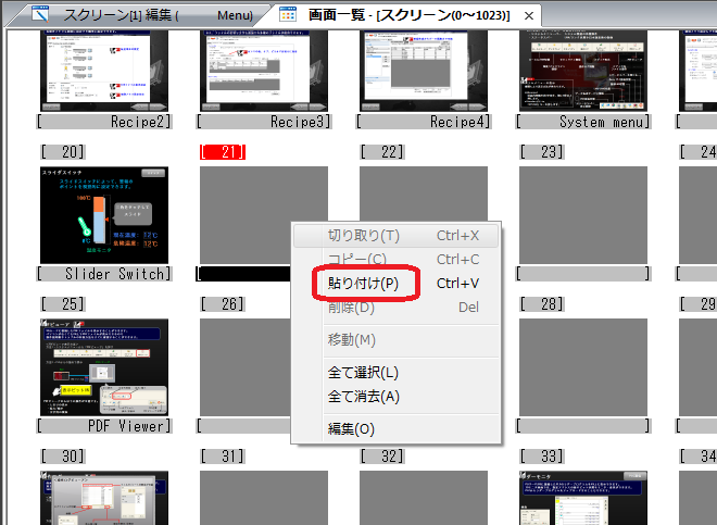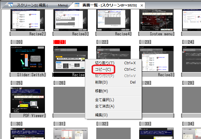 コピー元の画面をクリック(No. が赤色に反転)し、右クリックメニューを表示します。[コピー]をクリックします。