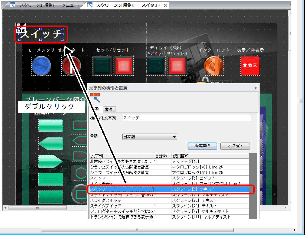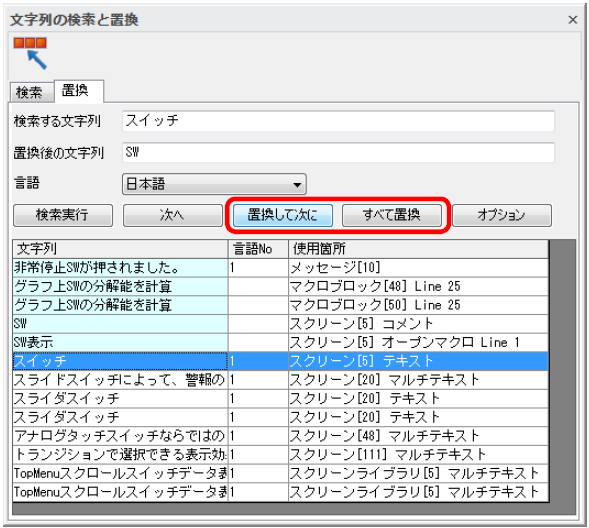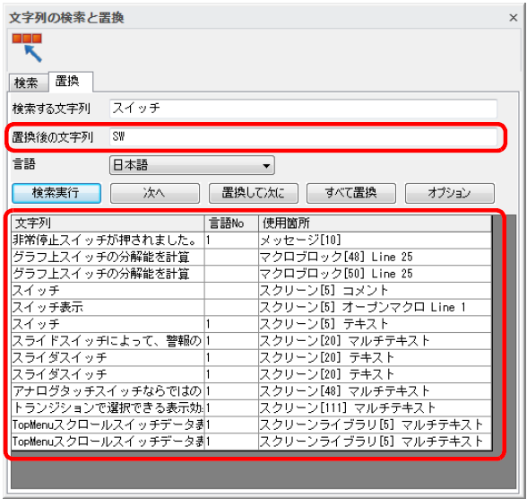 [検索結果一覧]上に、文字列 “スイッチ” が含まれる箇所を一覧表示します。 *