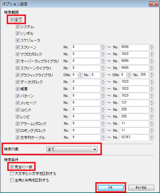 「検索範囲」、「検索条件」を設定し、[OK]をクリックします。