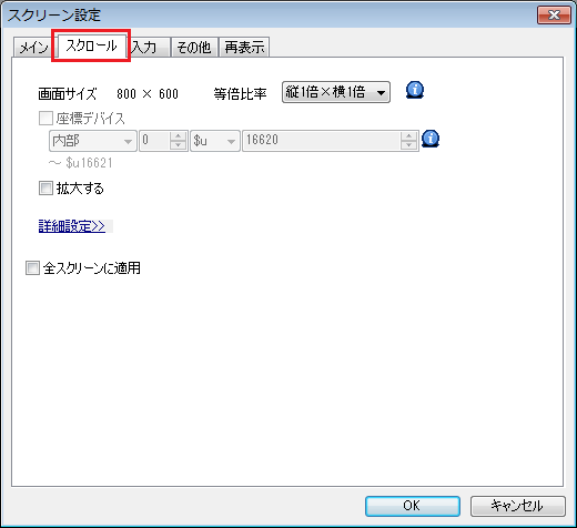 - [画面設定]→[スクリーン設定]→[スクロール]をクリックします。