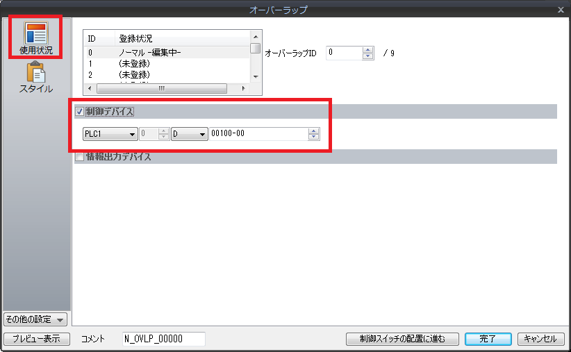[オーバーラップ]アイコンをダブルクリックして、「表示方法:制御デバイス」に設定します。