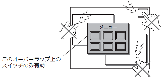オーバーラップ表示中、ベース画面上、他のオーバーラップ上のスイッチを禁止したい。