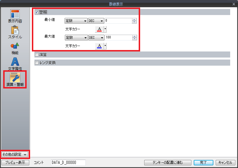 [数値表示]ダイアログ→[その他の設定]→[演算・警報]→[警報]にチェックします。