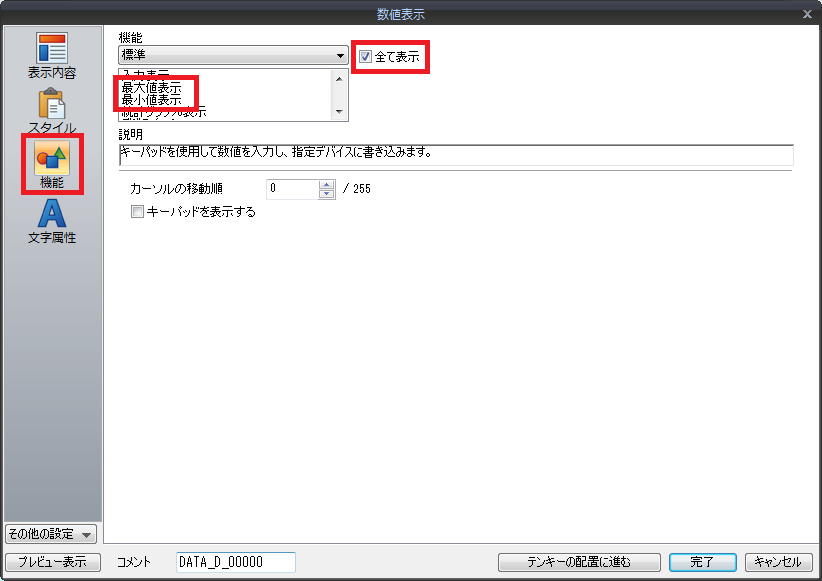 2. 制限の最大値、最小値を画面上に表示させる場合、[機能]→[全てを表示]にチェックして、[最大値表示]、[最小値表示]に設定した数値表示をそれぞれ配置します。