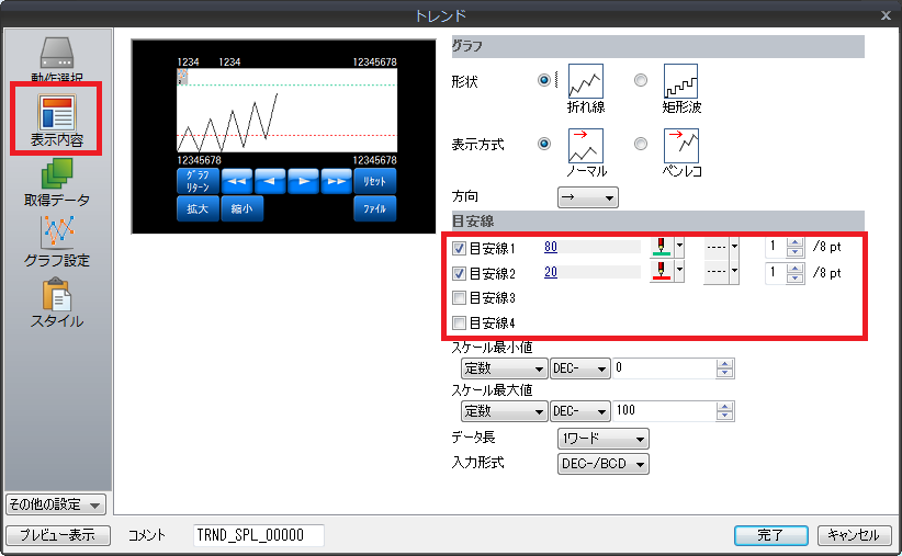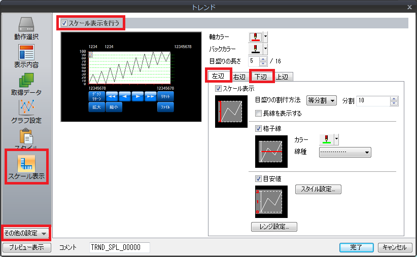 1. [トレンド]ダイアログ→[その他の設定]→[スケール表示]