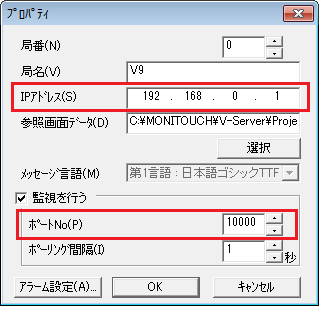 監視モニタのプロパティでVシリーズ(TELLUS HMI)のIPアドレスとポートNoを設定します。