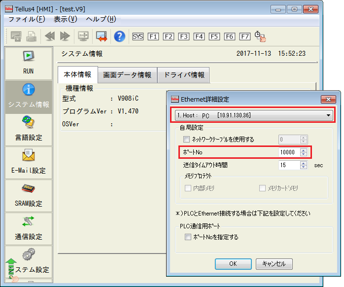 • TELLUS4 HMIのIPアドレスとポートNoは[ローカル画面]を表示後[ファイル]→[Ethrenet詳細設定]で確認できます。