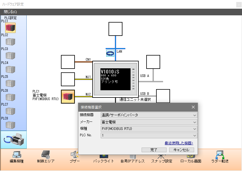 V-SFTの[システム設定]→[ハードウェア設定]→「PLC1」 に温調器の設定をします。