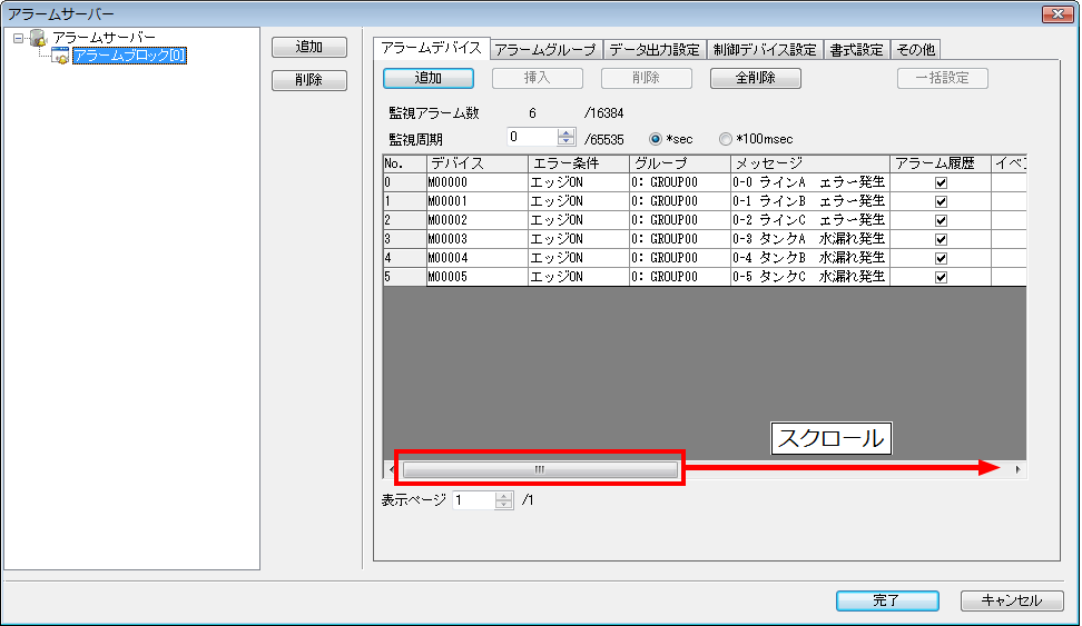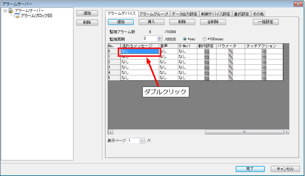 [システム設定]⇒[アラームサーバー]⇒[アラームデバイス]で、一覧表示を