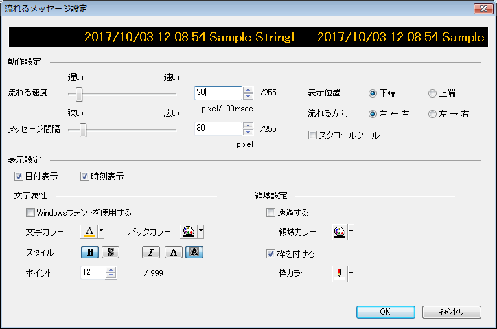 [編集]をクリックすると、流れるメッセージの速度や色、表示位置などの属性を