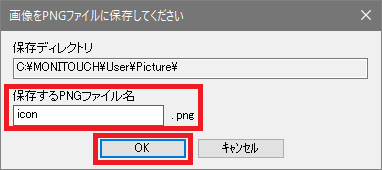 [画像をPNGファイルに保存してください]のダイアログで、保存するPNGファイル名を任意で指定し、[OK]をクリックします。