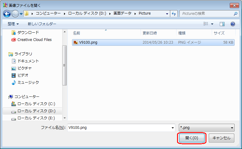 2. [画像ファイルを開く]ダイアログで、取り込むファイルを選択し[開く]をクリックします。