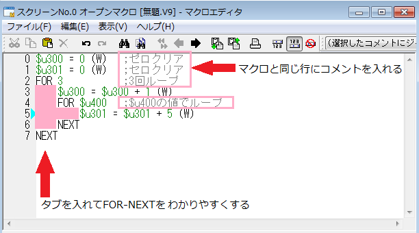 タブを使ってインデントを行うことで、マクロの構造が把握しやすくなります。