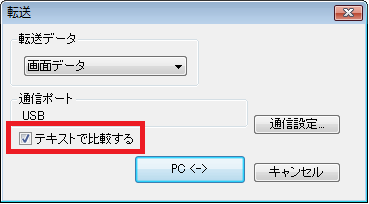 [転送]→[転送比較]で、「テキストで比較する」にチェックを付けて[PC <->]をクリック