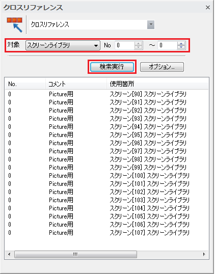 - [対象:スクリーンライブラリ]、検索したいスクリーンライブラリNo.を設定して[検索実行]をクリックします。