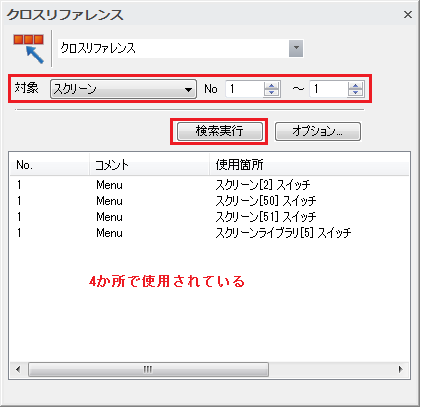 [対象:スクリーン/オーバーラップライブラリ]、検索したいNo.を設定して[検索実行]をクリックします。