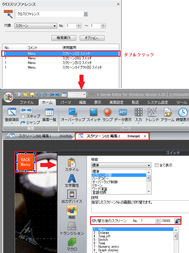スクリーン切替スイッチの使用箇所を探したい。 オーバーラップライブラリ呼出スイッチの使用箇所を探したい。