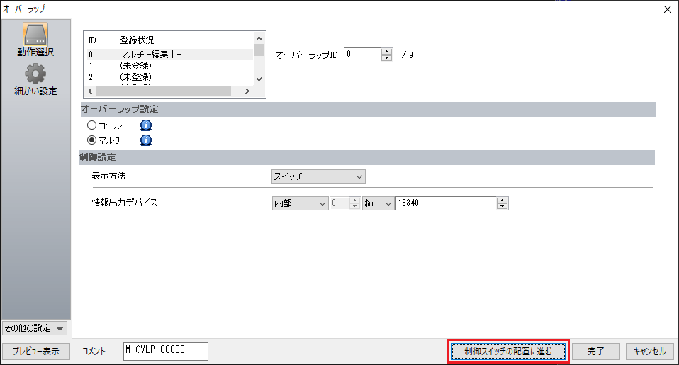 配置したオーバーラップアイコンの「オーバーラップID」と、スイッチの機能→「オーバーラップID」は合わせておきます。